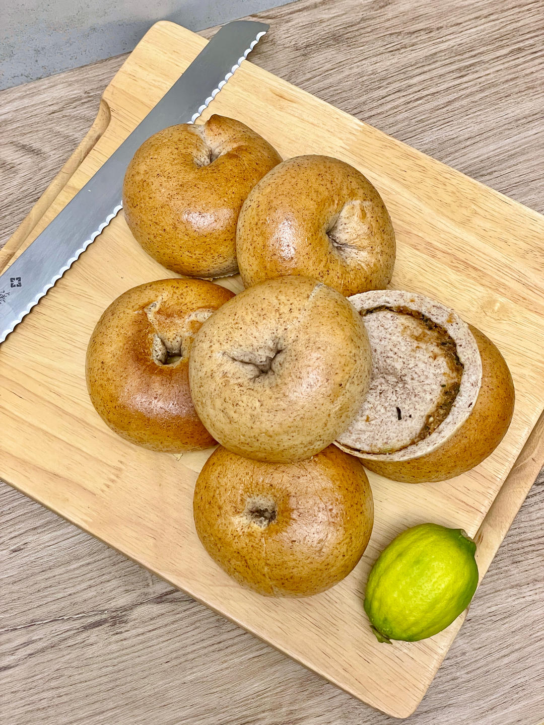 加了花生酱和紫菜肉松,这次做顺手很多,妞尝了一个,打了90分,并建议下次包馅的再多放一些,大胆放😆
