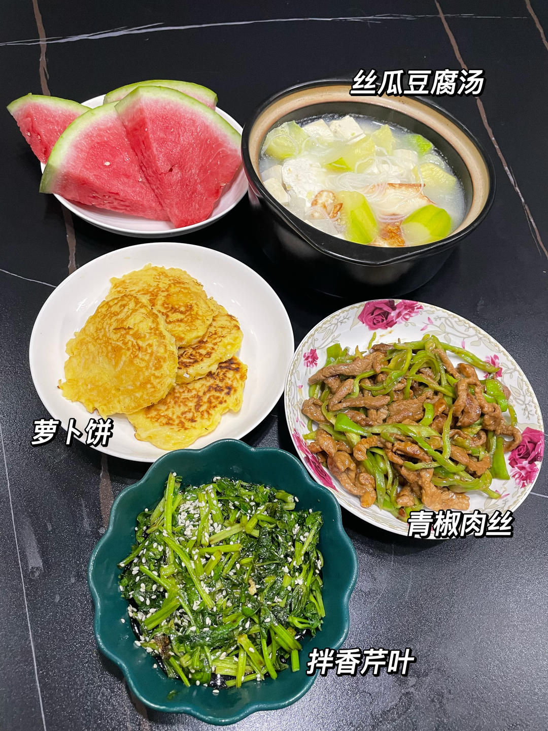 青椒肉丝,丝瓜豆腐汤,萝卜饼,拌香芹叶