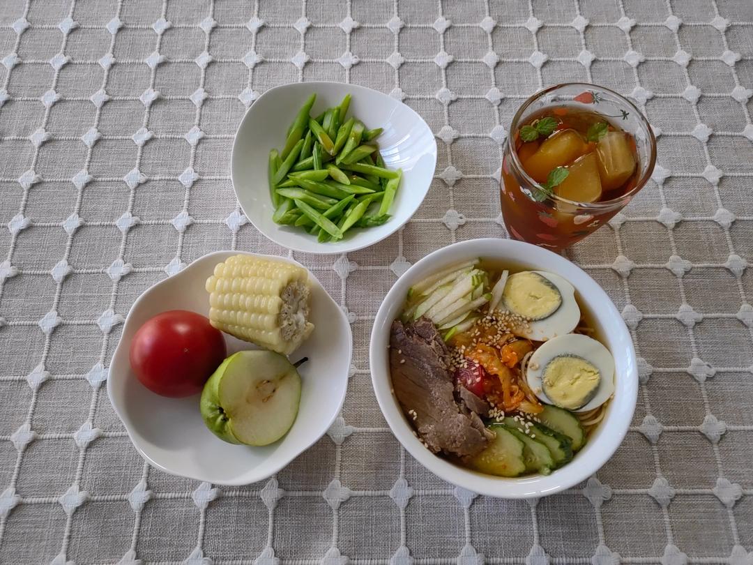 冷面,玉米,芦笋沙拉,番茄,梨,冰大麦茶