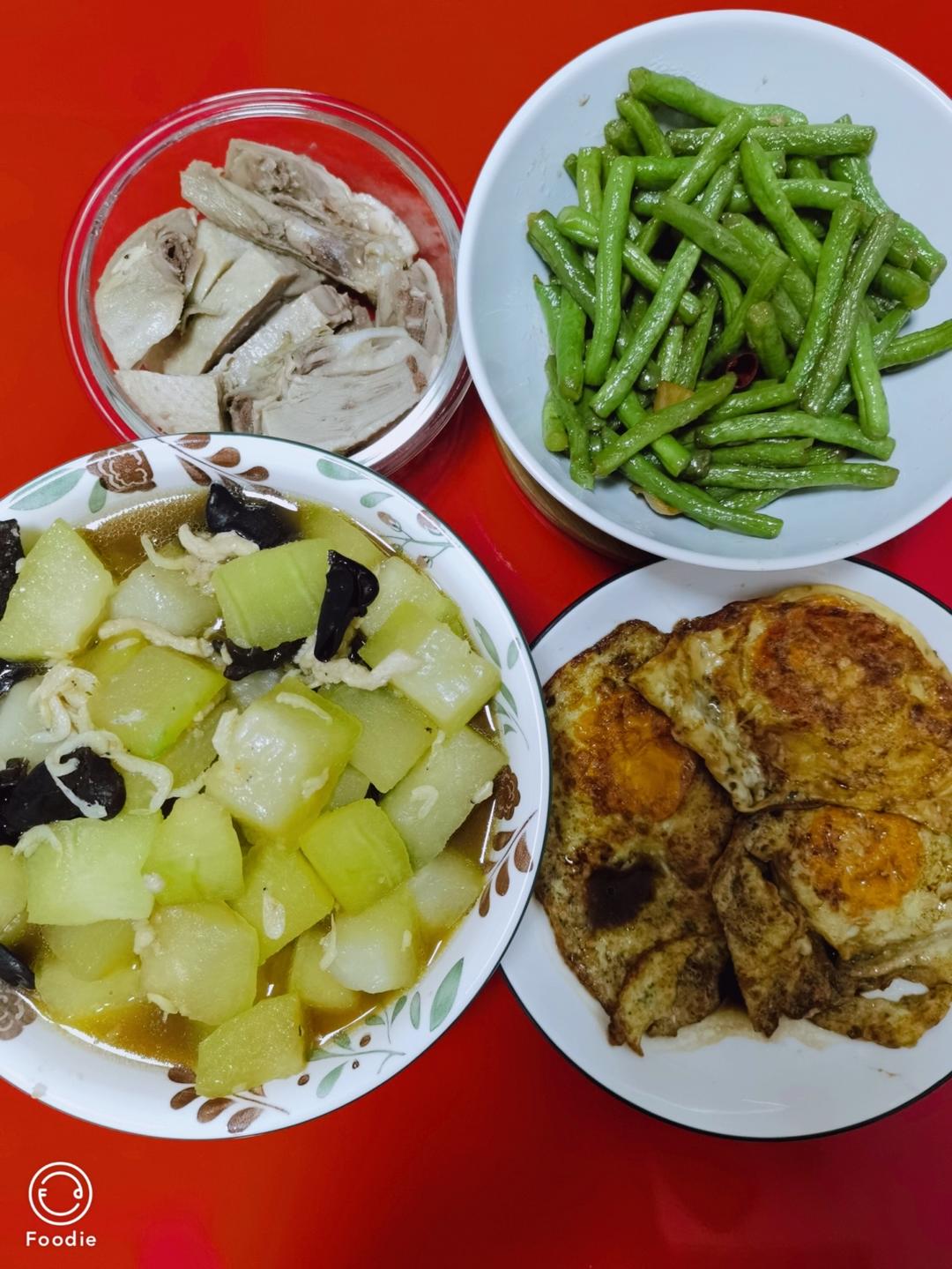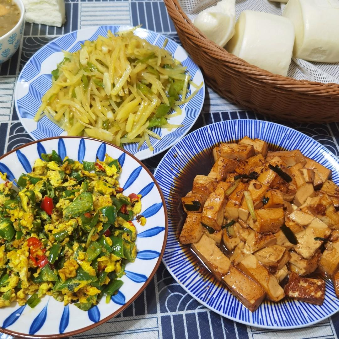 丰盛的晚餐,绿豆米粥,馒头,青椒土豆丝,炒鸡蛋,烧豆腐