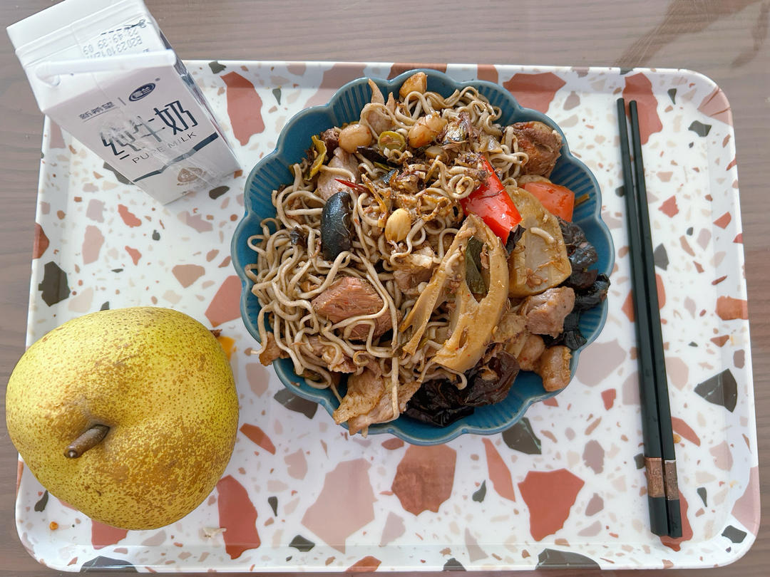 麻辣香锅+🍐+牛奶🥛