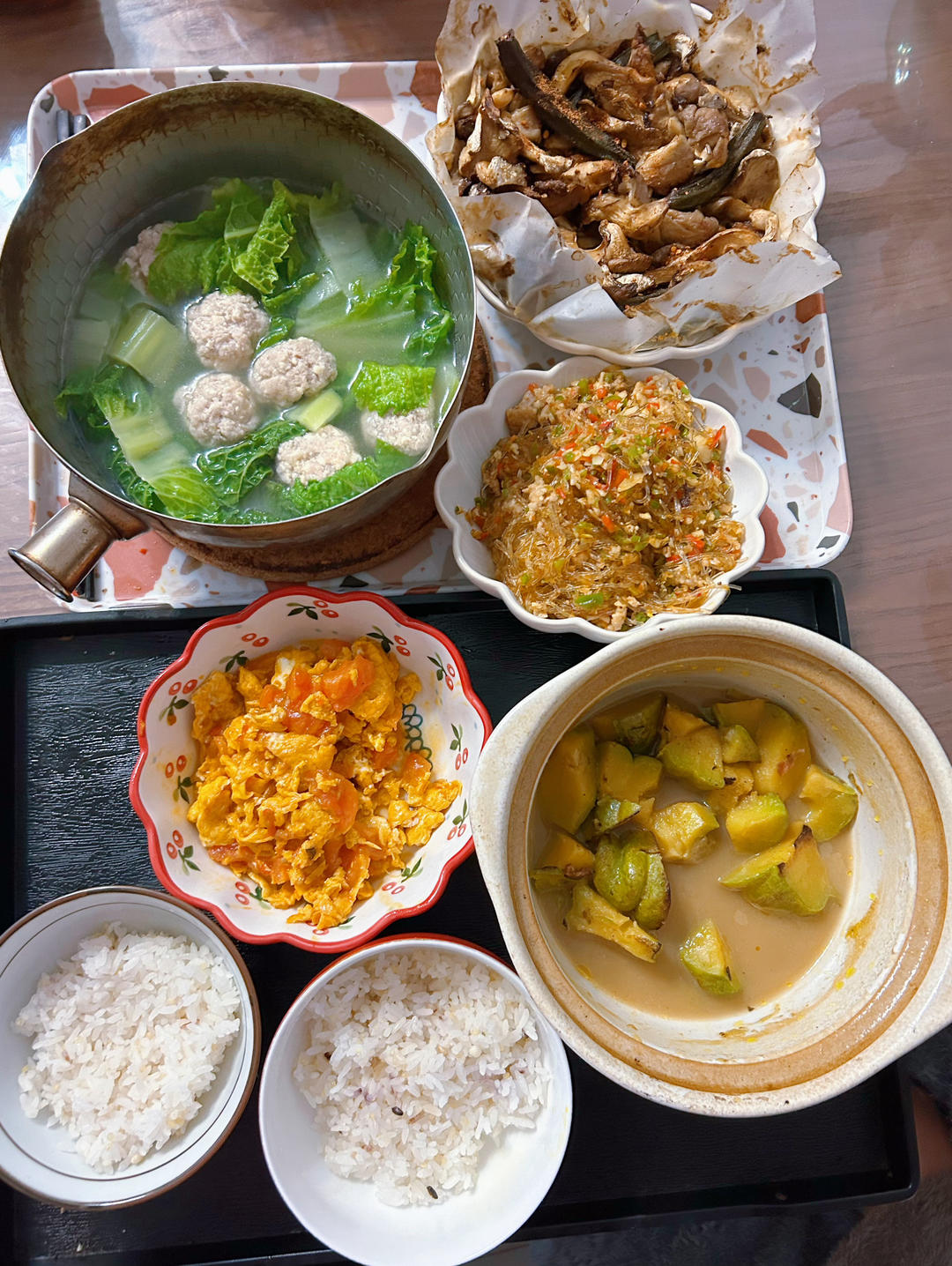 肉沫粉丝+烤平菇+白菜圆子汤+生焖小瓜+番茄炒鸡蛋