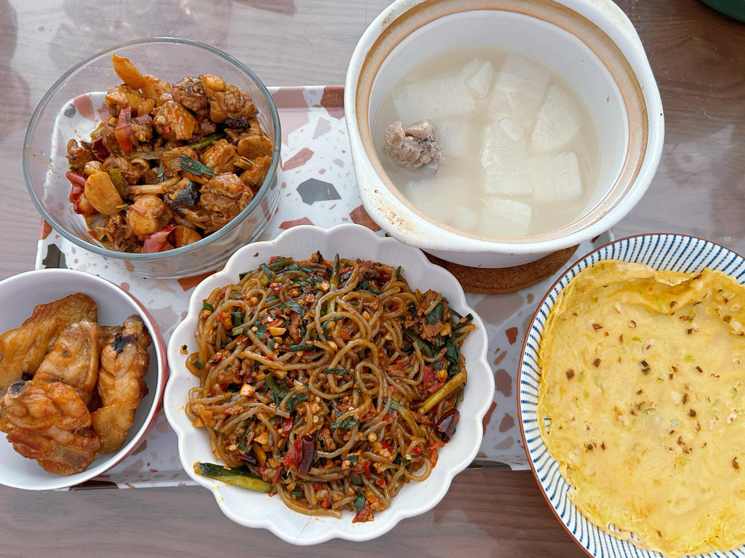 蚂蚁上树+辣子鸡+烤鸡翅+鸡蛋饼+萝卜排骨汤