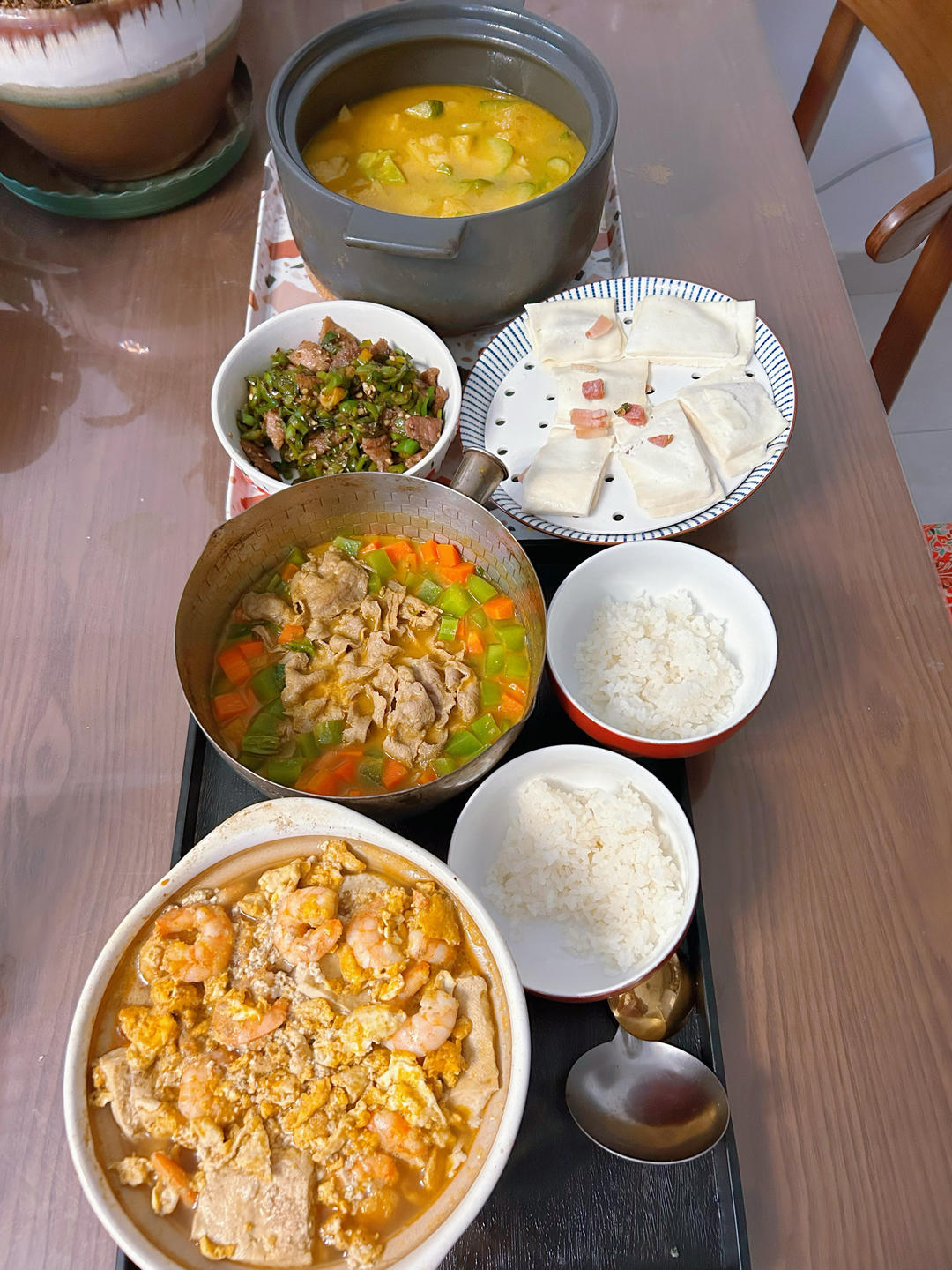 鲜虾豆腐煲+咖喱肥牛+乳饼夹火腿+青椒炒肉+生焖小瓜