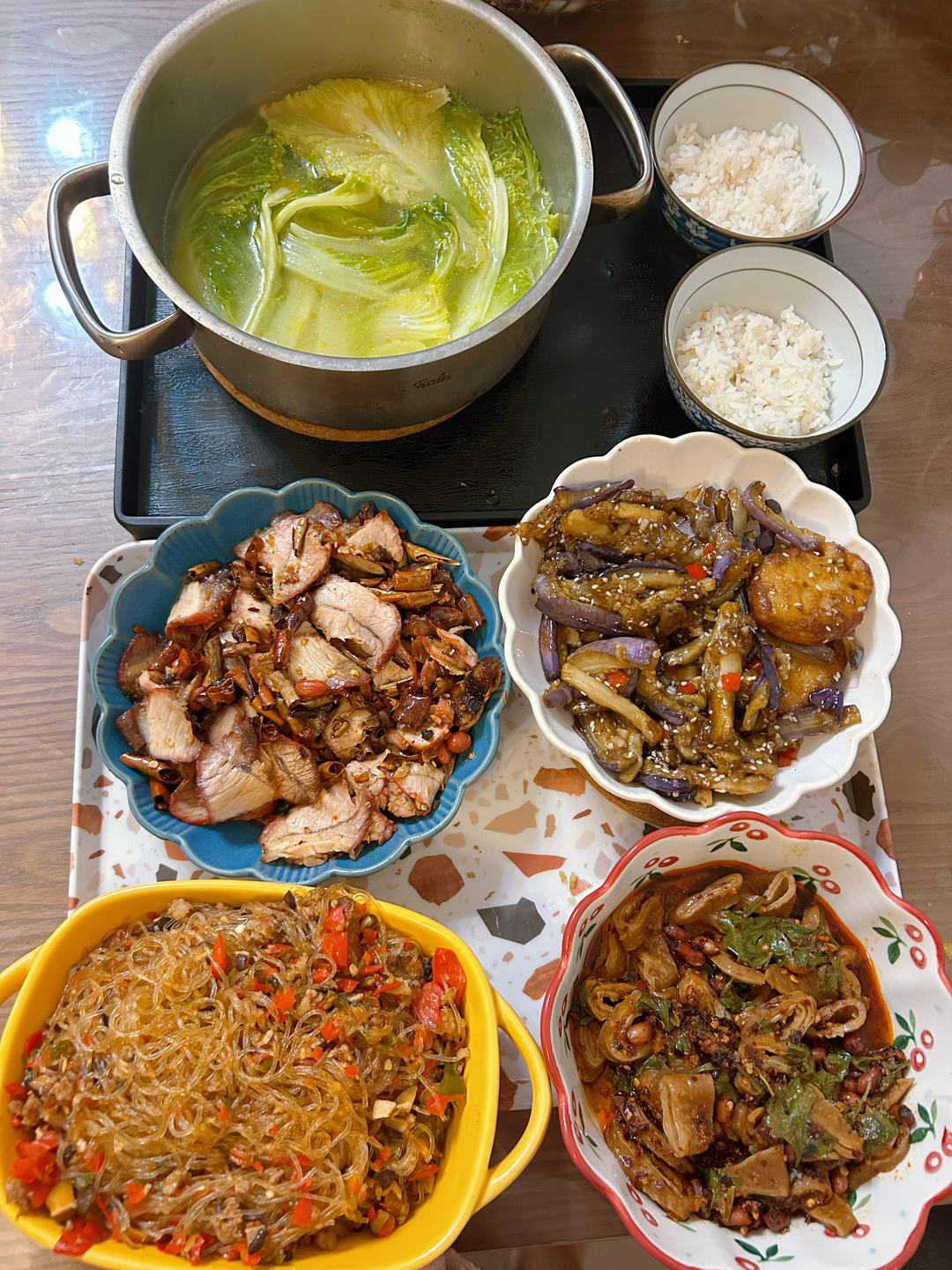 风味茄子+蚂蚁上树+卤肥肠+叉烧+白菜汤