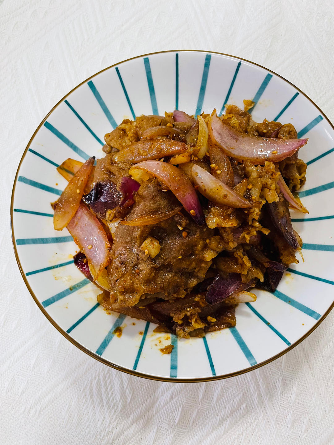 晚餐🥣洋葱🧅炒羊肉卷、炖豆角茄子🍆、蘸酱菜,东北这个季节天天豆角茄子,好吃😋,吃不够