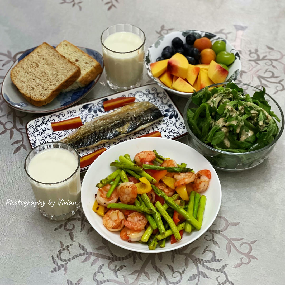 午晚餐|香煎青花鱼+彩椒芦笋黑虎虾仁+芝麻酱冰草+全麦奇亚籽吐司+时果小拼+醇豆浆~🌷