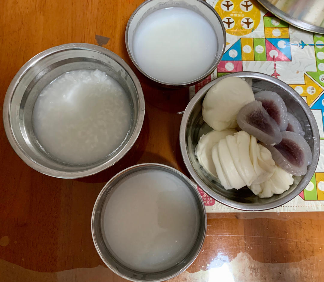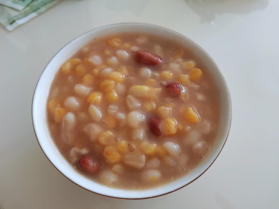 🌽玉米碴黄的白的各两小杯,加上一小把花芸豆,浸泡一夜,高压锅豆类35分钟,开锅加碱面再压1...