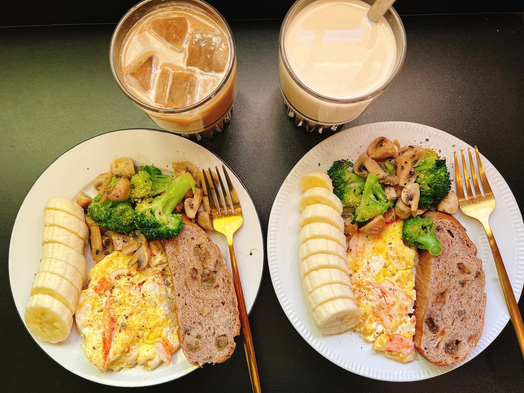 香蕉核桃欧包,蟹柳烘蛋,口蘑西蓝花🥦,香蕉🍌,奶冲老姜红糖糕伪“奶茶”&冰咖啡...