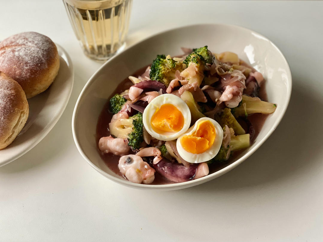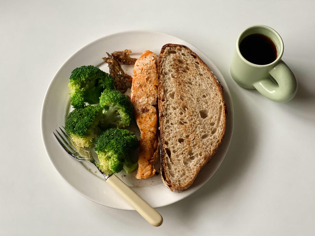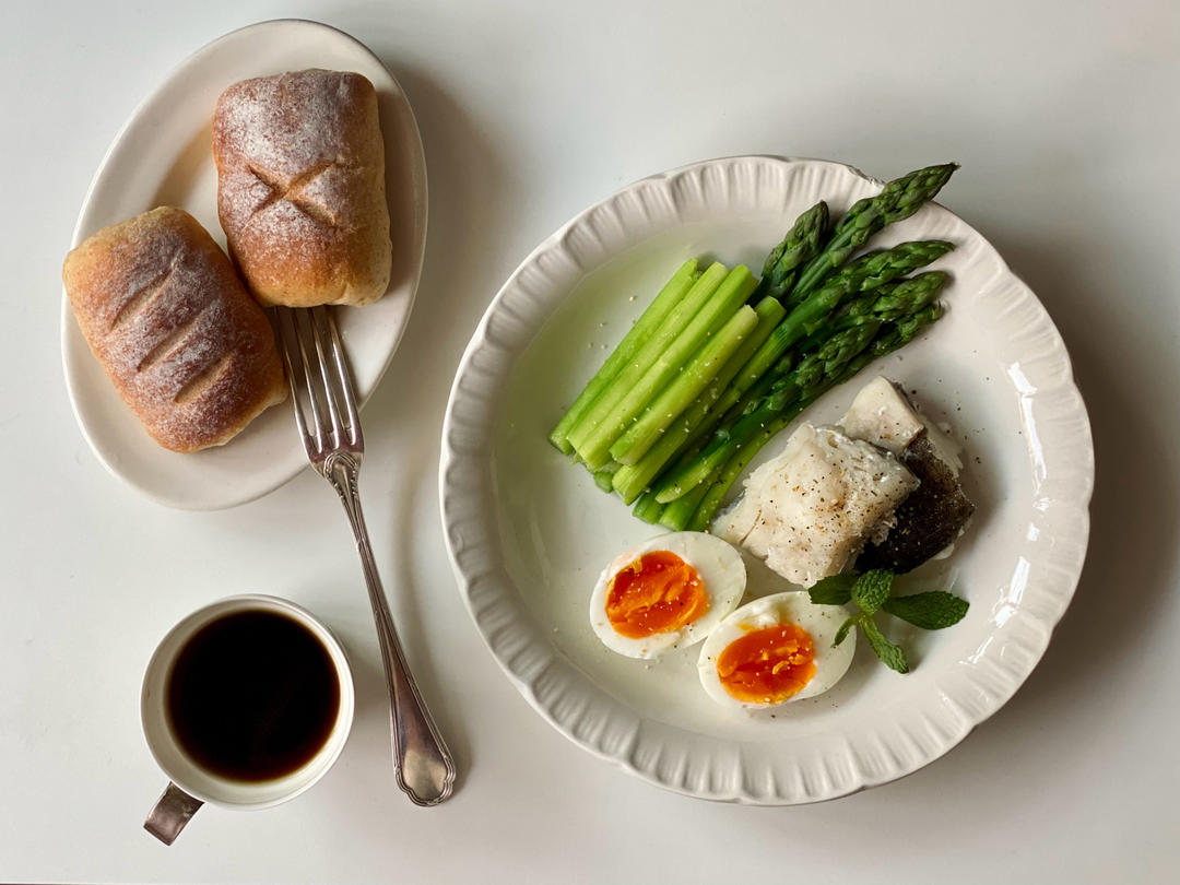 🈶️:蒸鳕鱼、白灼芦笋、溏心鸡蛋、土豆面包&黑咖啡