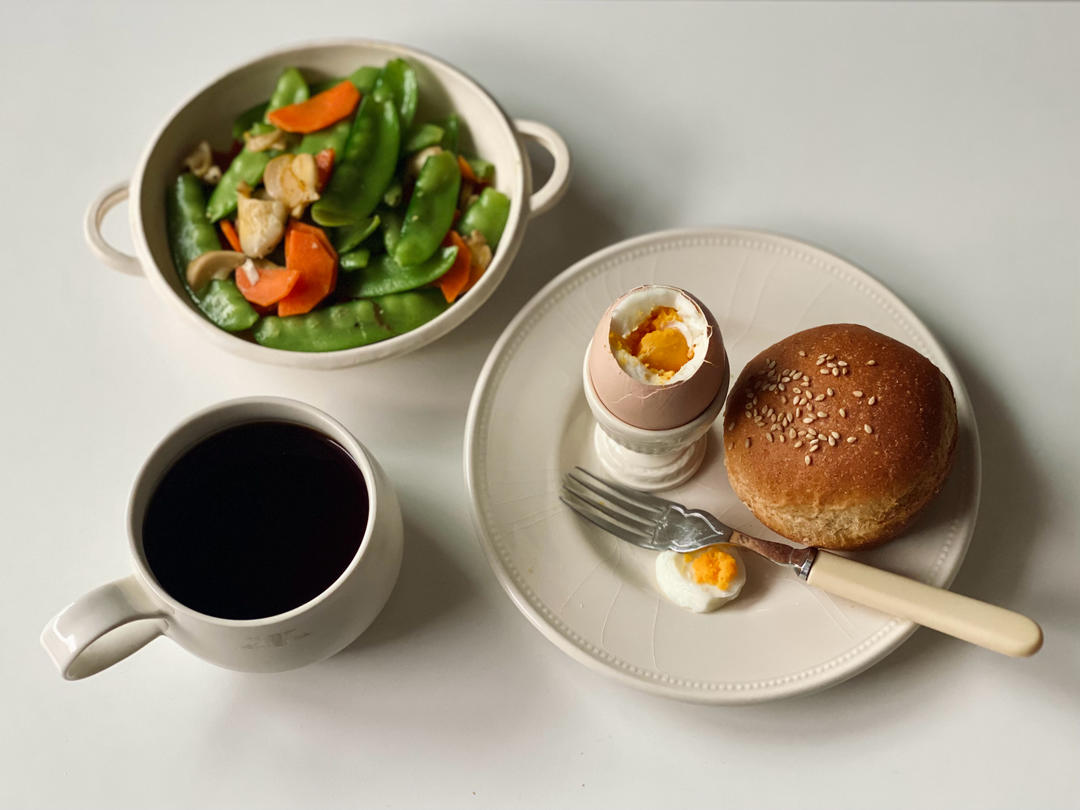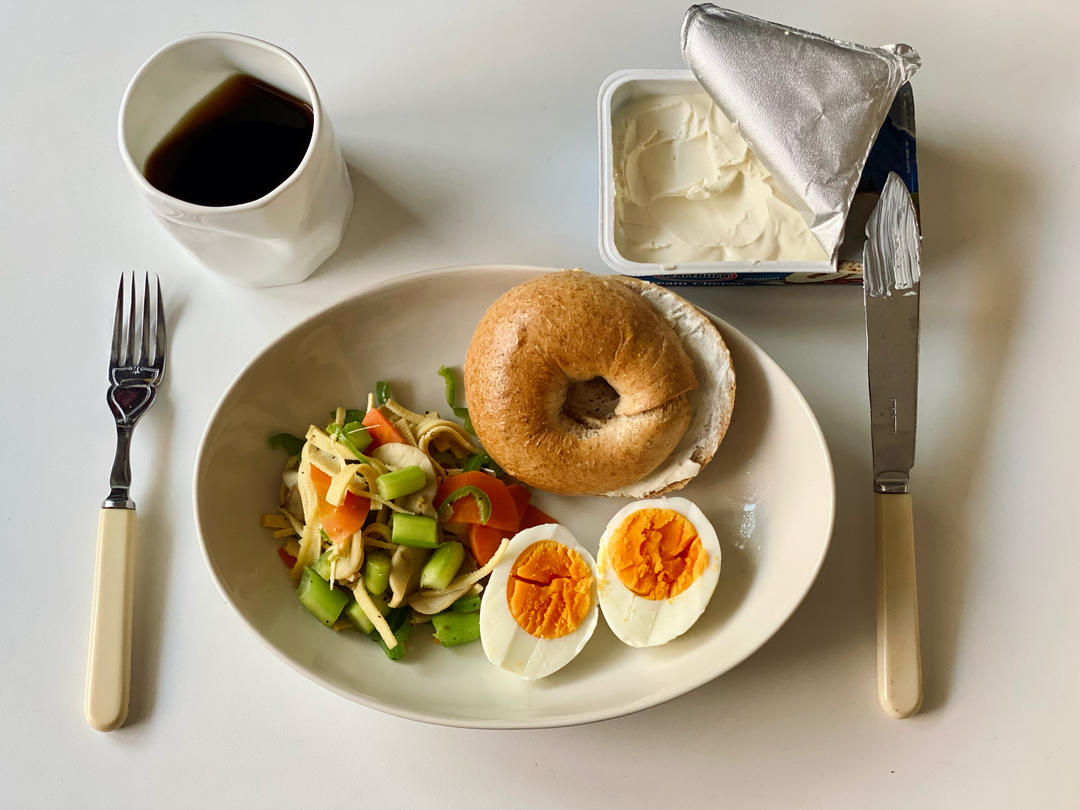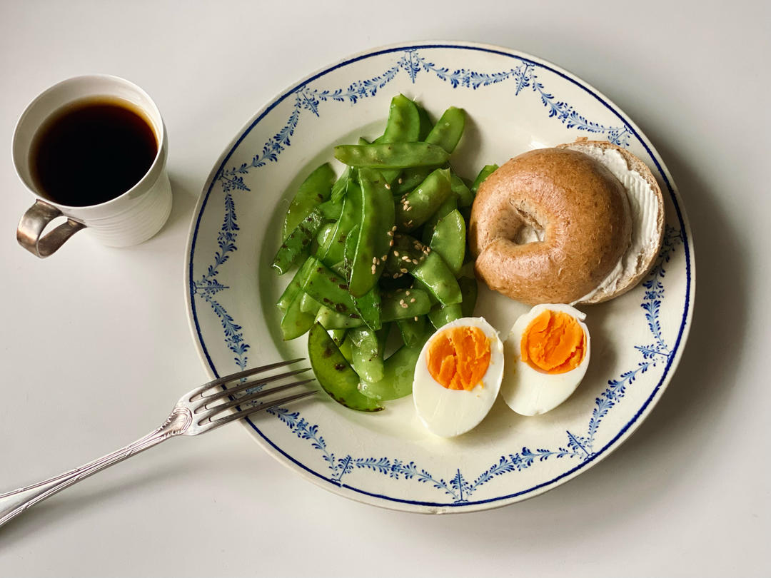 🈶️:清炒荷兰豆、蒸鸡蛋、涂抹奶油干酪&贝果、黑咖啡