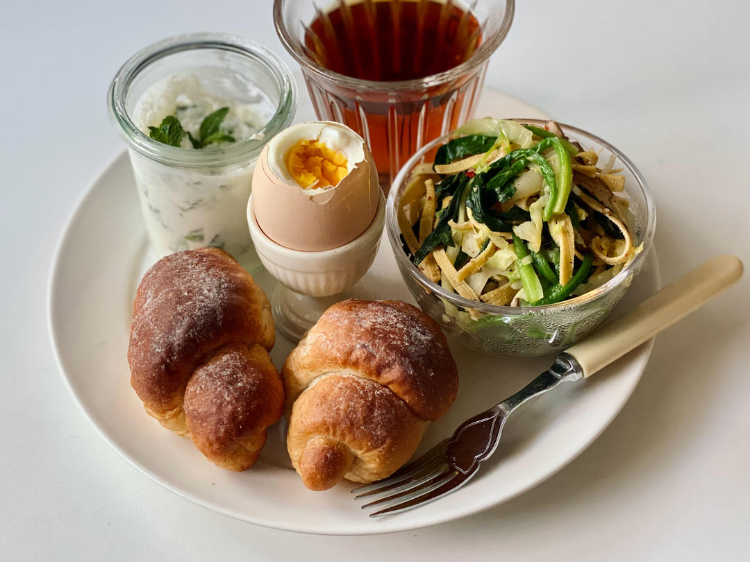 🈶️:炒素什锦(菠菜、卷心菜、香菇、千张和薄荷)、水煮鸡蛋、薄荷酸奶、土豆面包&...