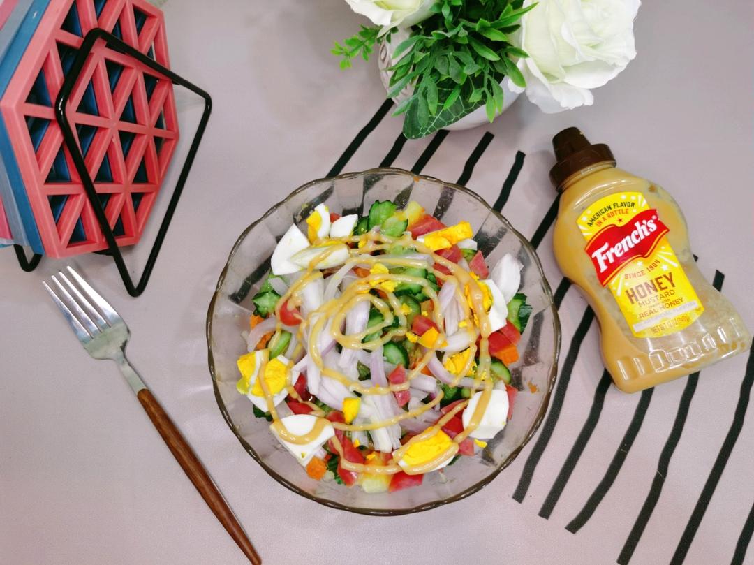 周末的餐桌有鱼有肉,清淡的蔬菜沙拉也得来一份,今天用的是我的最爱——蜂蜜芥末酱调的味,低卡又健康😁#午餐•2022年9月...