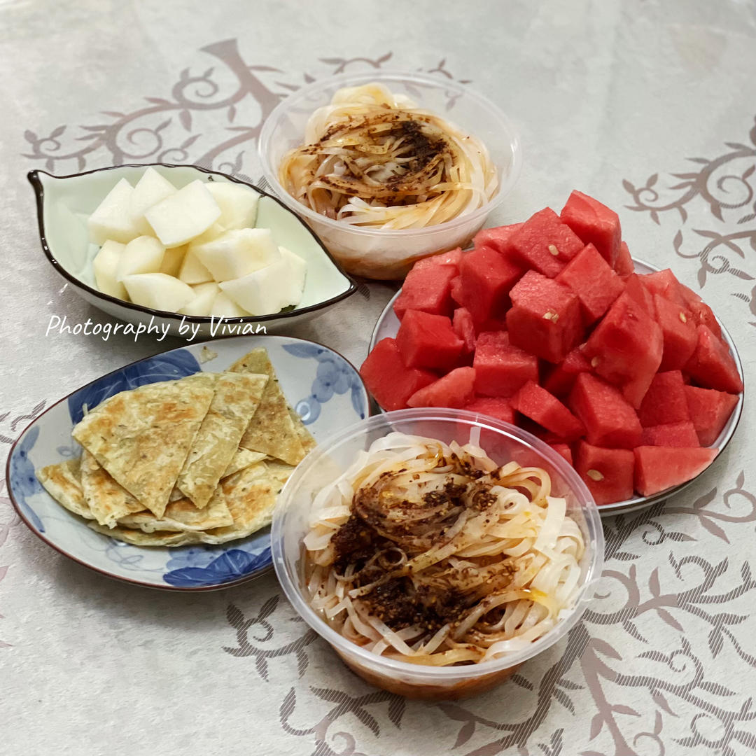 午晚餐|拴马桩擀面皮+手抓饼+麒麟瓜+秋月梨~🌷