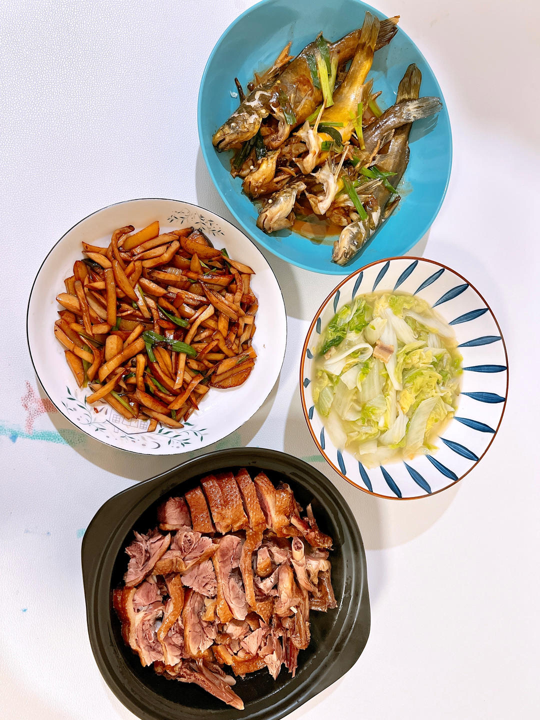 红烧黄骨鱼+卤鸭煲+杏鲍菇炒土豆+猪油渣炒黄丝白