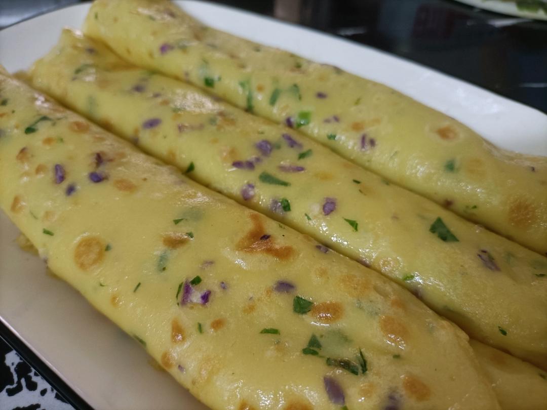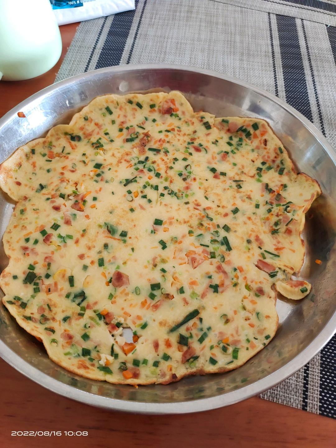 放了玉米肠和葱,胡萝卜。我用电饼铛做的,超方便!儿子说,这是我吃过最好吃的早餐😄😄