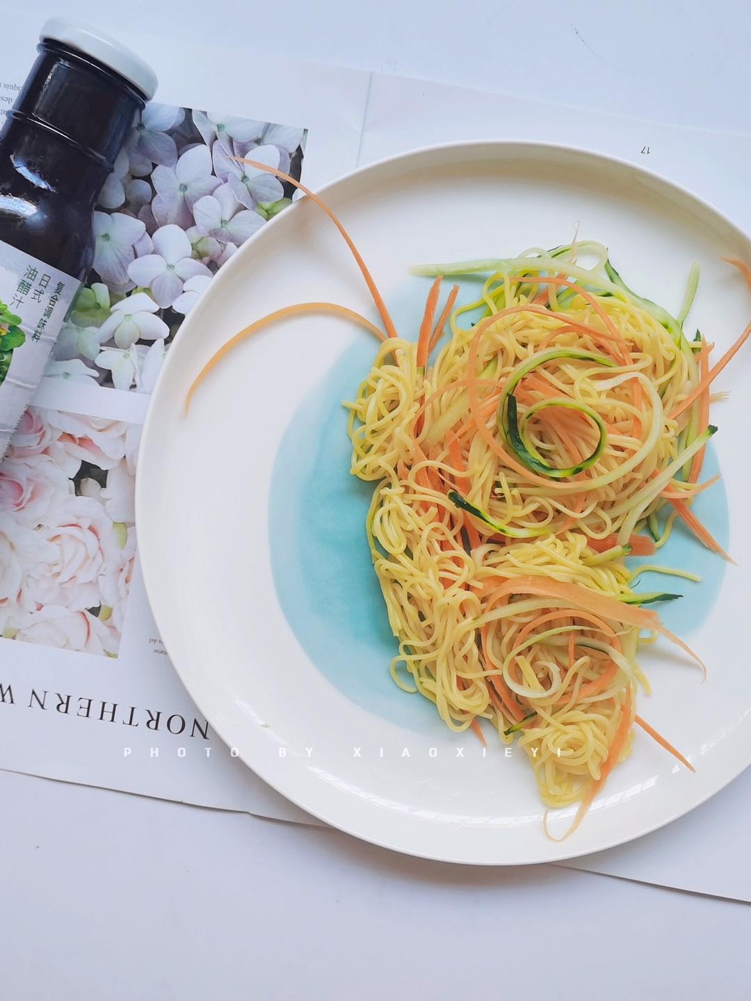将食材放在一起,淋上味好美日式油醋汁,jio拌jio拌~青瓜清爽,胡萝卜爽脆,玉米面筋道~