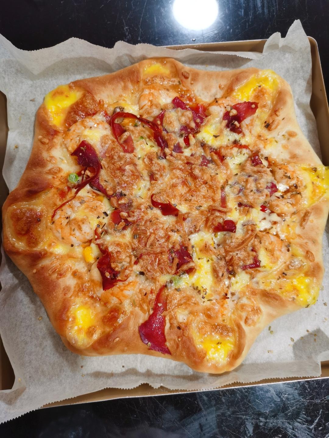 下班回来心血来潮,用青岛大虾、萨拉米和西班牙火腿烤了个豪华版披萨。方子很好,饼底很好吃很好吃😋#晚餐•2022年8月23...