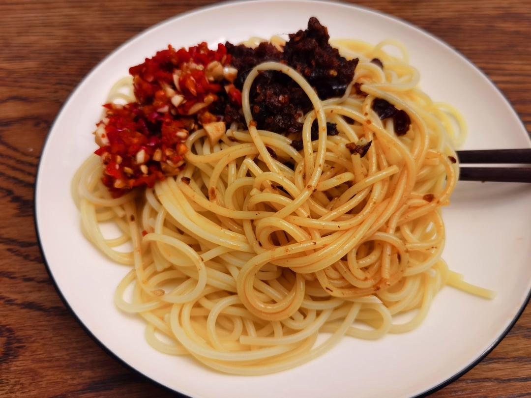 我自己的意面,这属于我的,不想吃番茄味,自己加了辣酱和牛肉酱。哈哈哈。