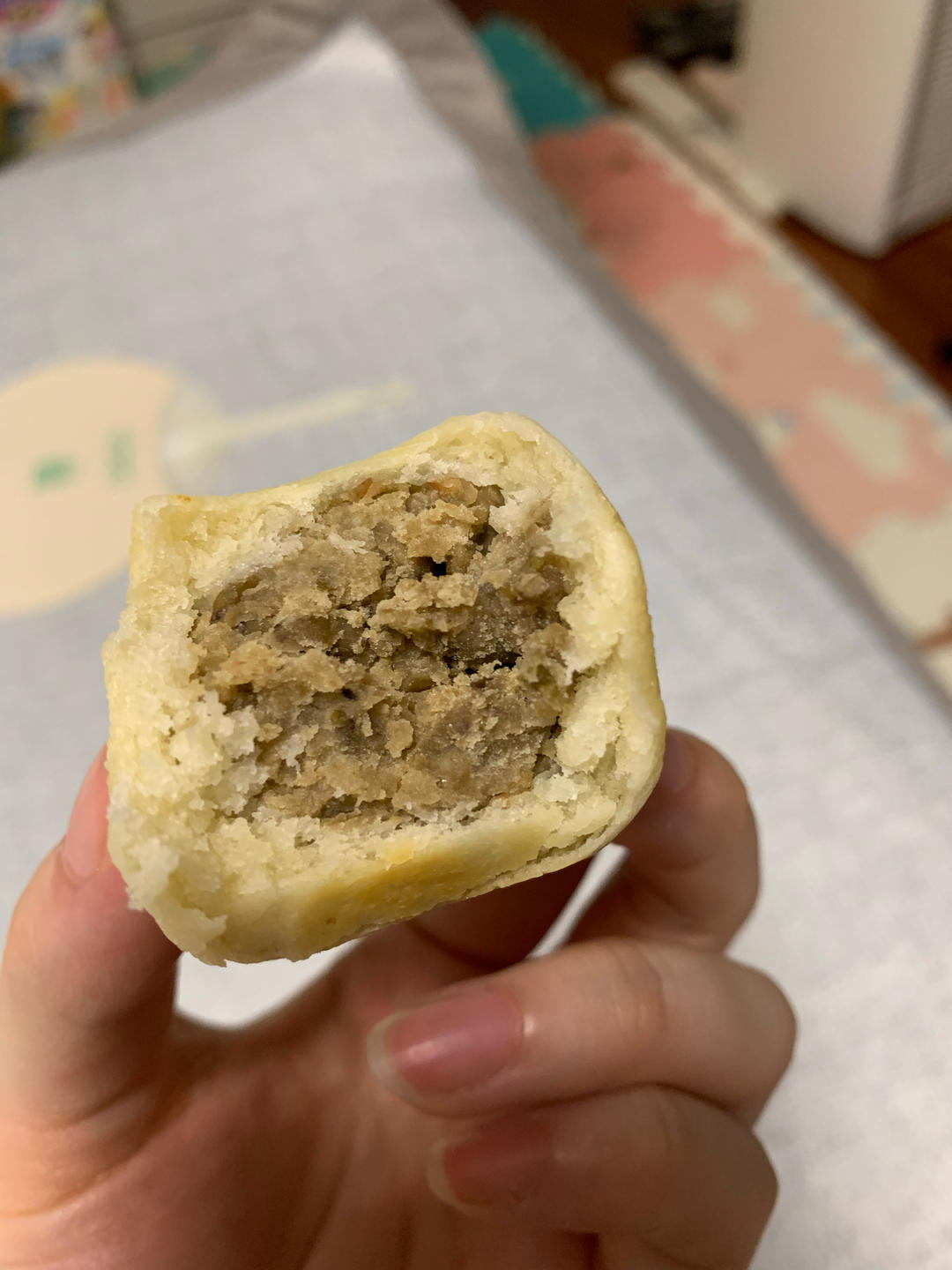 很干,很淡,能吃出酵母和绿豆的香味