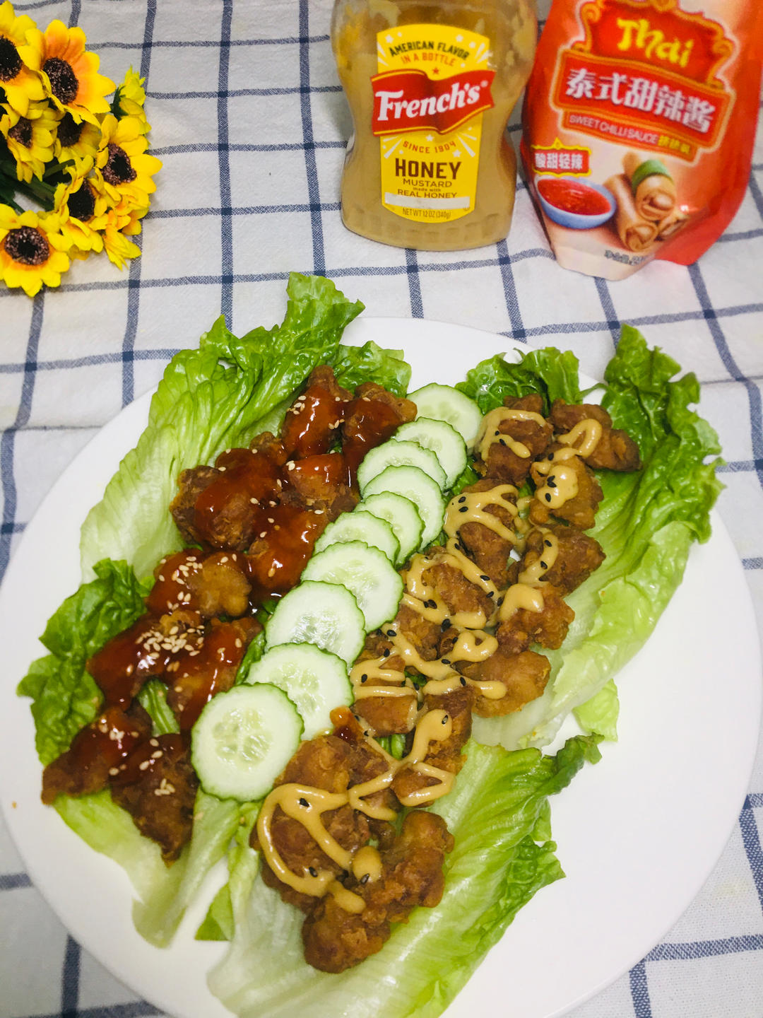 双拼无骨炸鸡块,挤入甜辣酱和蜂蜜芥末酱,真得超级无敌好吃