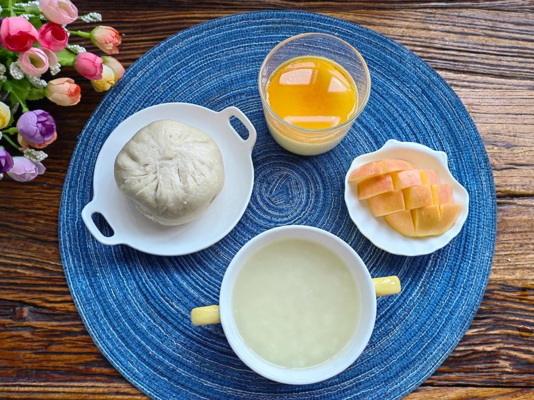 大米粥🥣+香菇肉包子🥟+鸡蛋羹🍮+苹果🍎