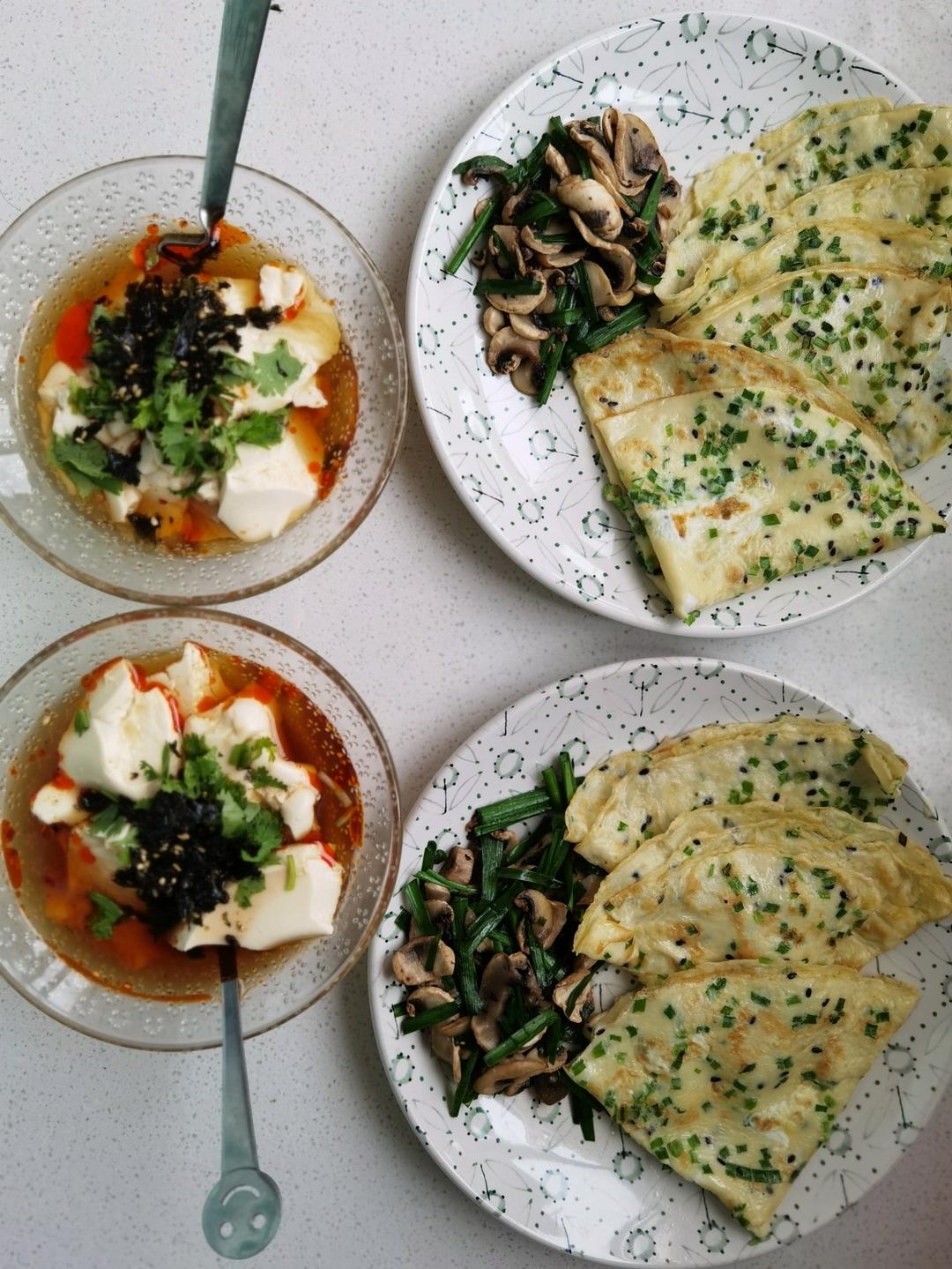 韭菜蛋饼+炒口蘑+咸豆花