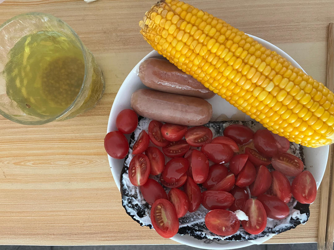 番茄奶酪全麦包➕烤肠➕煮玉米➕黑苦荞茶