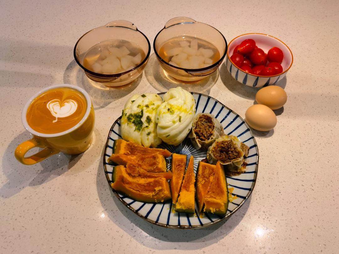 亨师傅早餐759:蒸花烧南白&炖梨汤&圣女果&奶咖。