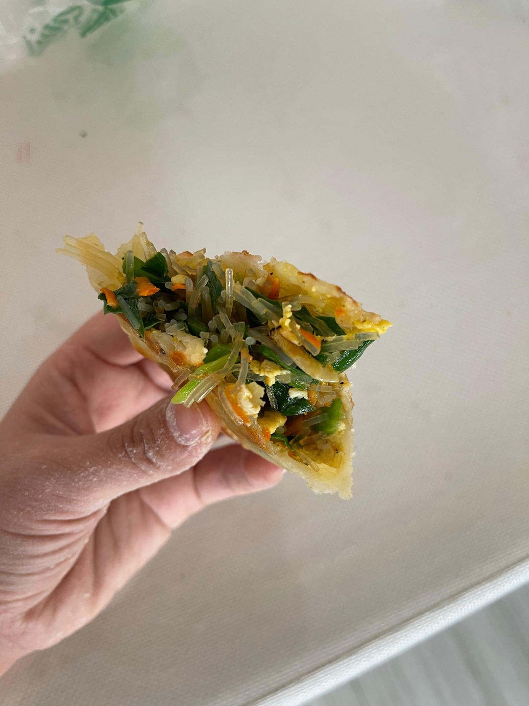 又薄又酥软的韭菜鸡蛋饼。关键在于和面,用开水烫面,一多半的面粉用开水烫后,再用凉开水浇到...