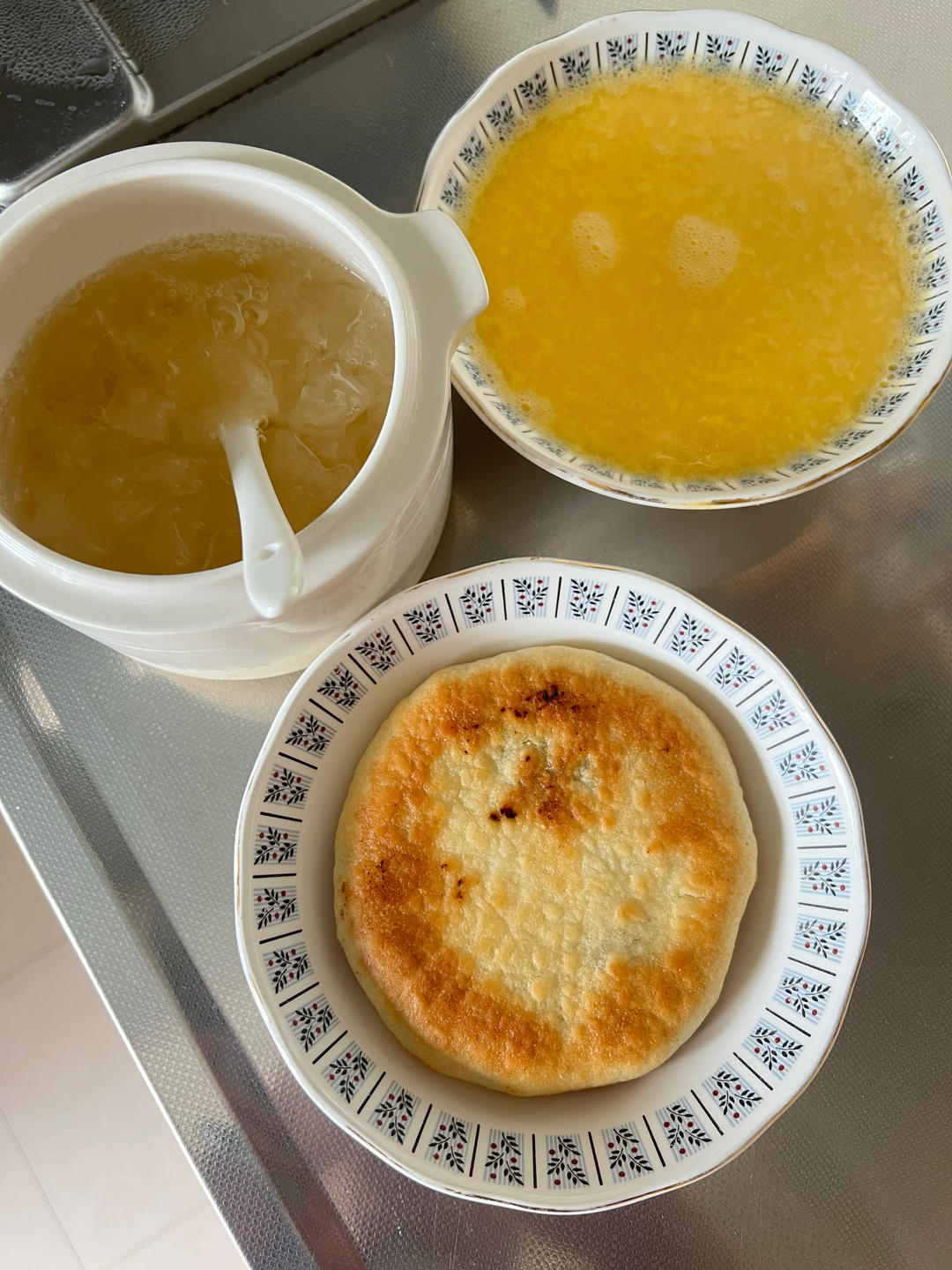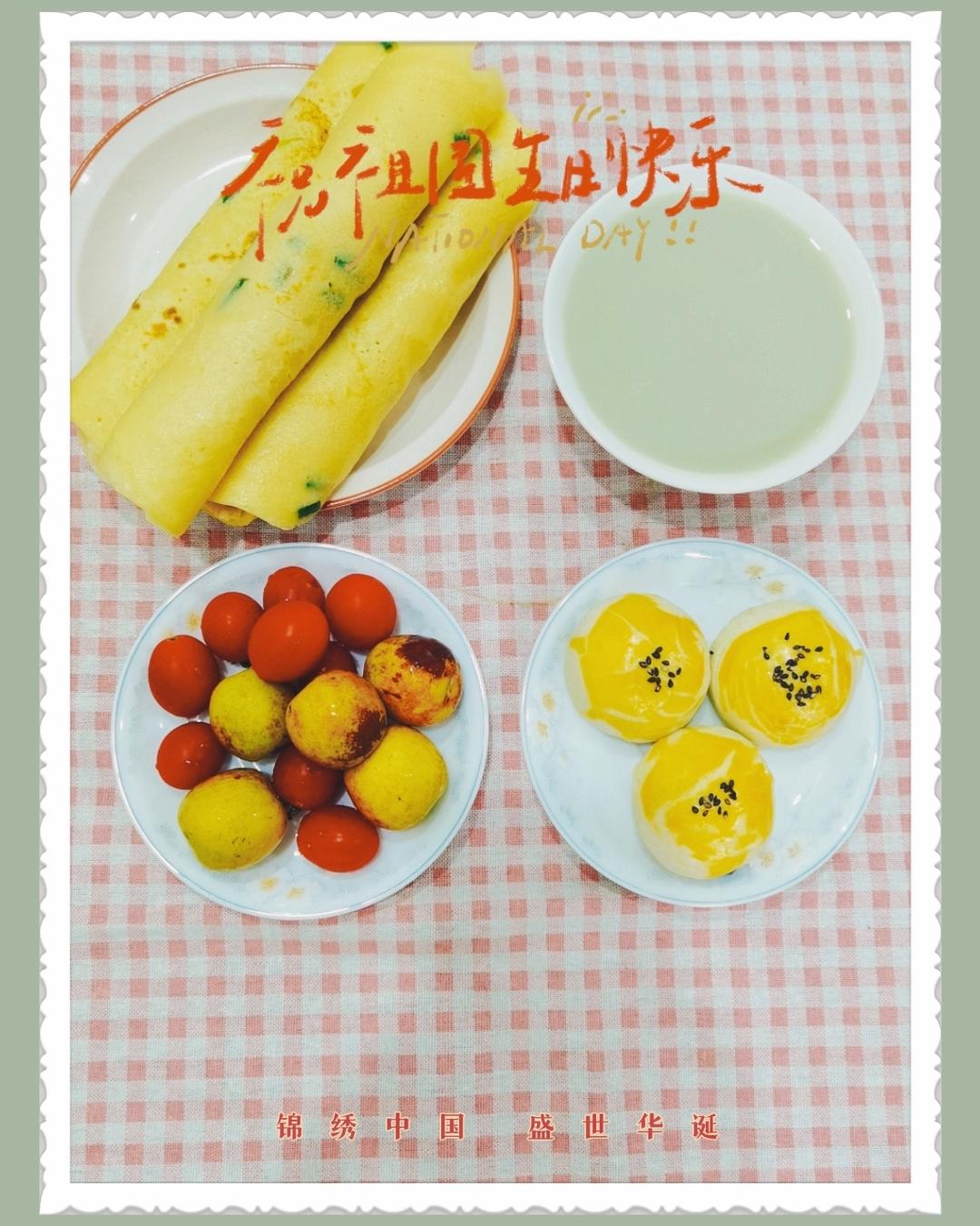 愿所有期待都能如你所愿。开启假期模式,早餐蛋黄酥,鸡蛋饼,绿豆薏米豆浆#早餐•2022年10月1...