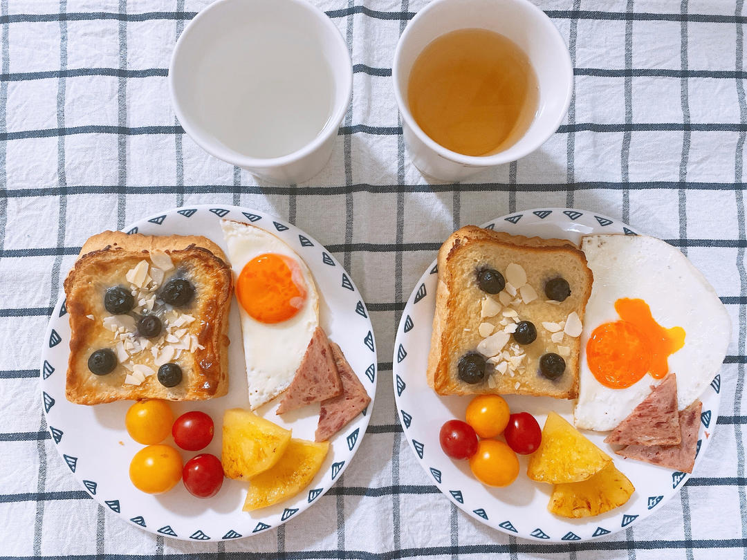 今日早餐:乳酪熔岩吐司、太阳蛋、煎菠萝、苹果醋苏打水