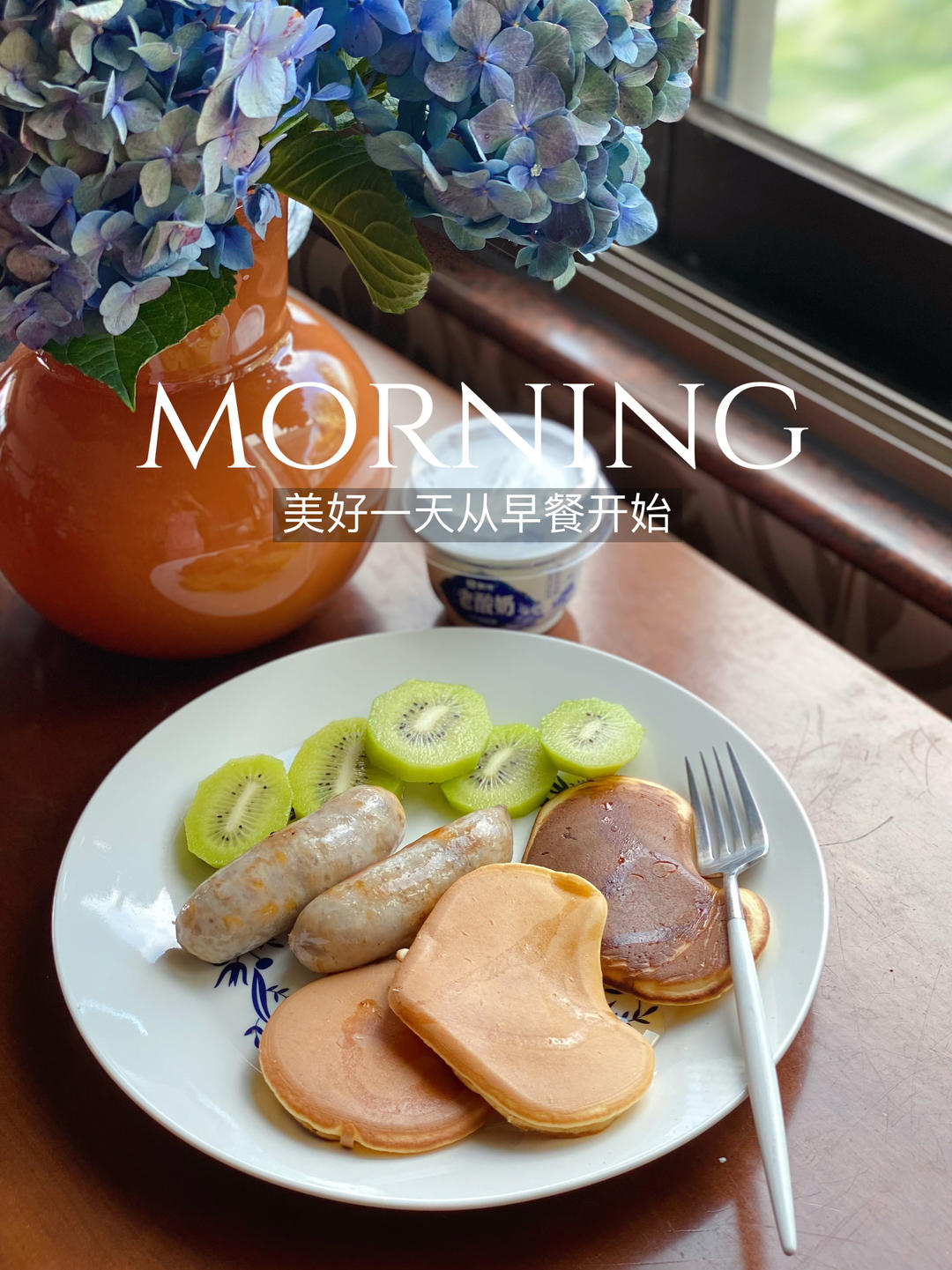 心形与圆形松饼,芝士肉肠,徐香猕猴桃,老酸奶。管饱!