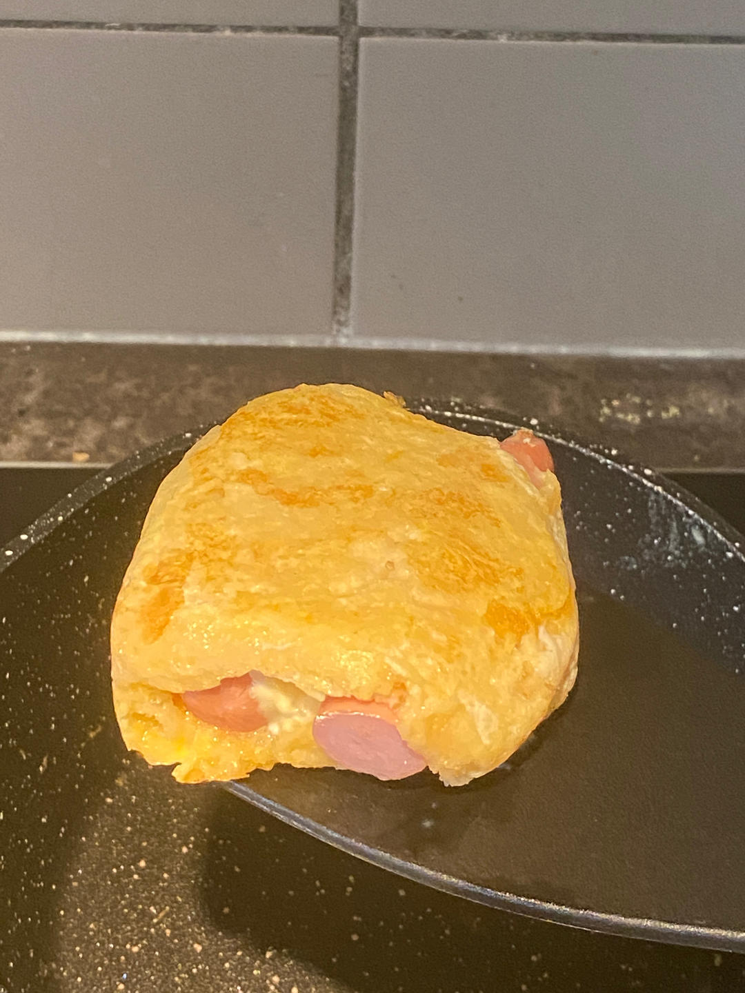 买的吐司有点不好卷,干脆俩叠一起了,加了马苏里拉芝士蛋黄酱和猪肉肠,美!