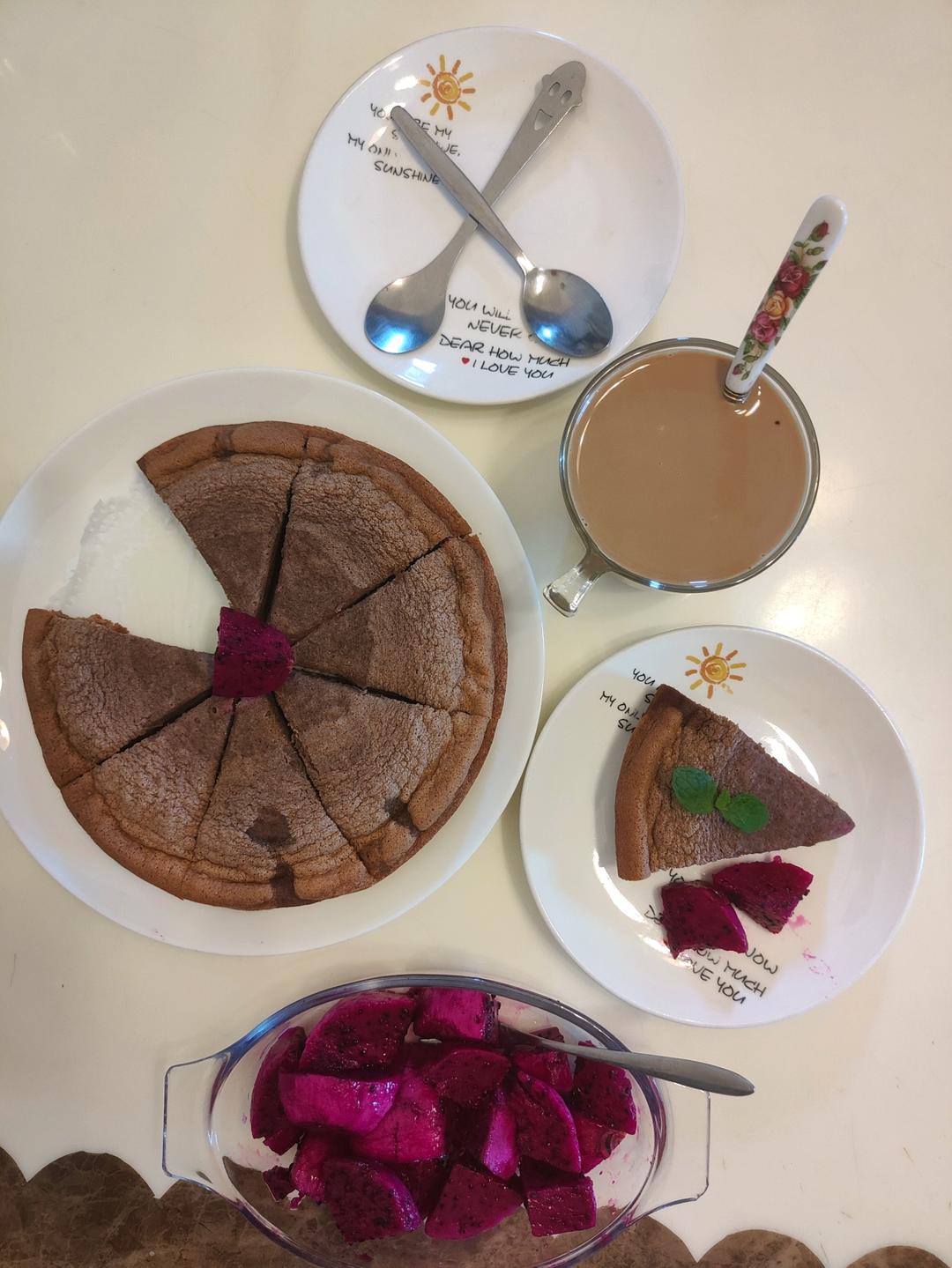 可可粉蛋糕🍰+红心火龙果+咖啡☕