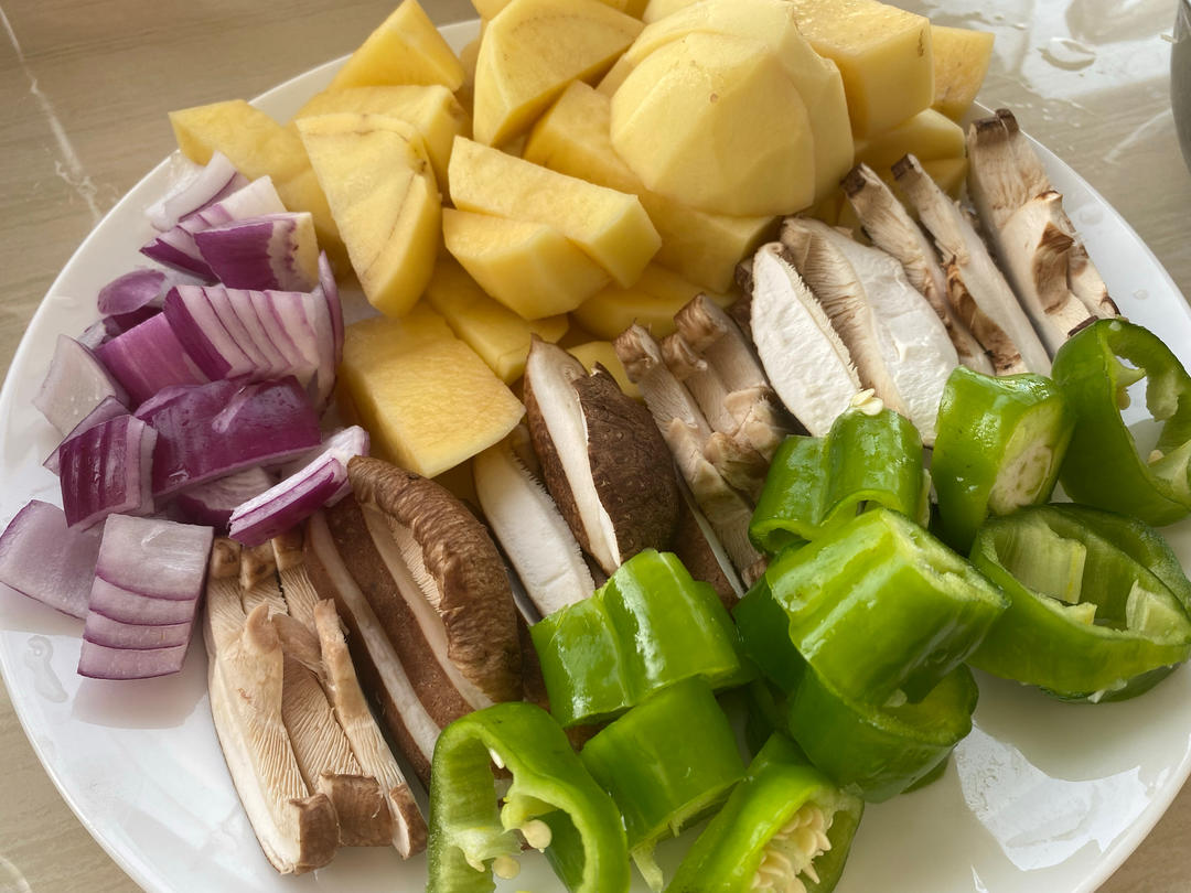 配料:鸡腿肉 土豆 紫洋葱 香菇 青椒 葱 蒜 料酒 生...
