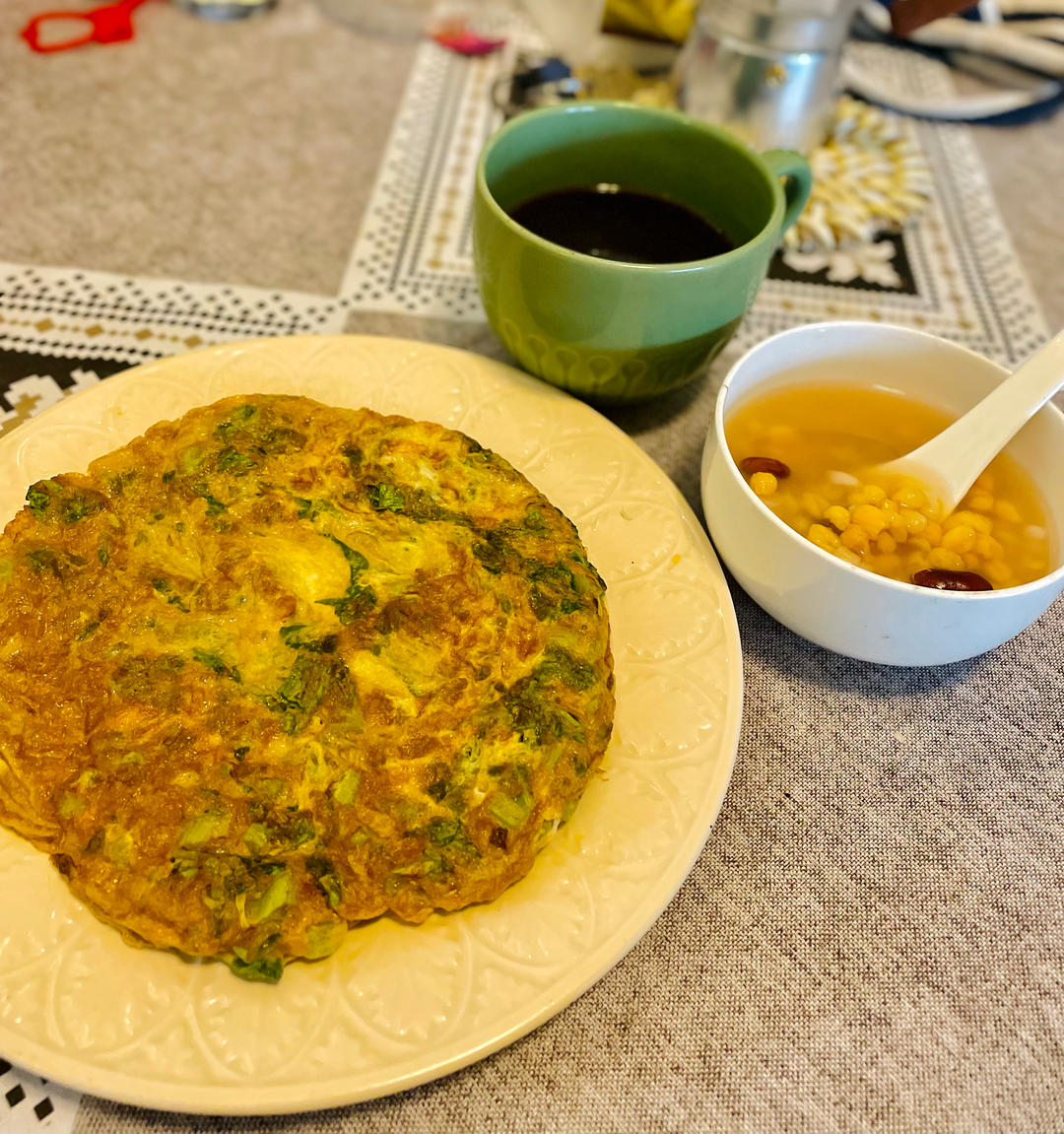 大碴子粥+青菜鸡蛋饼+黑咖