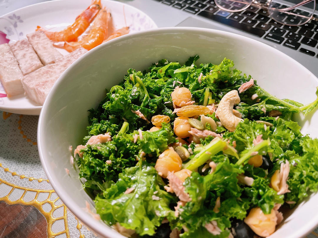 羽衣甘蓝+鹰嘴豆+金枪鱼+🫐+大拌菜汁=咸口羽衣甘蓝沙拉初尝...