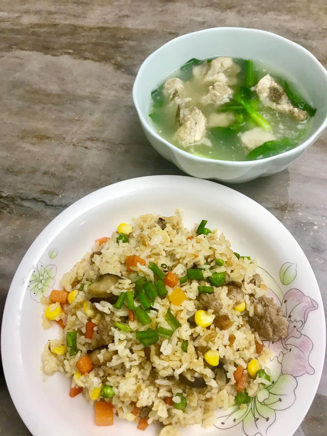 颜色丰富的炒饭哈哈,葱花有些多余。