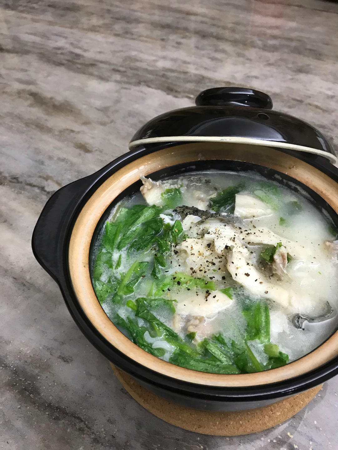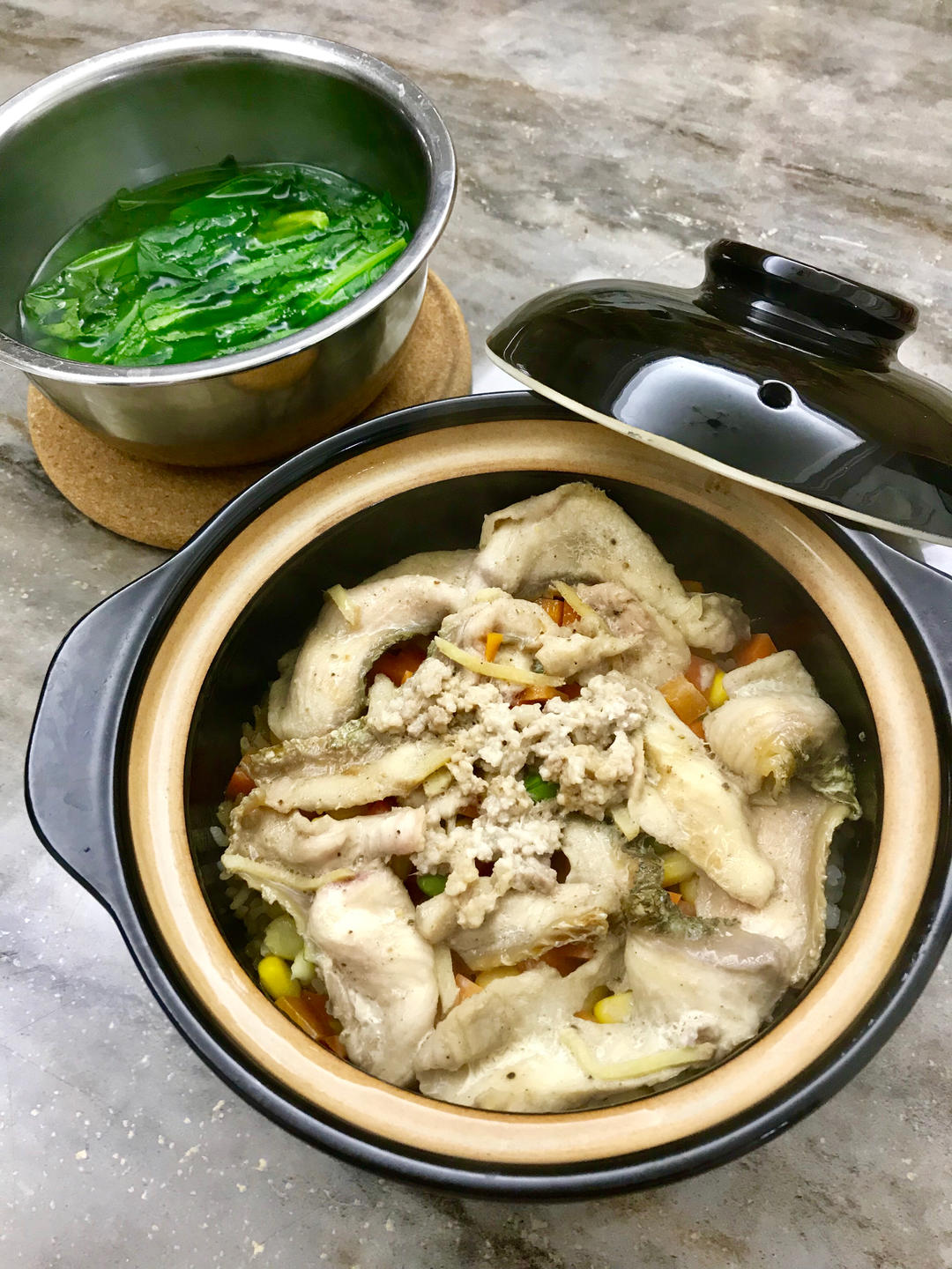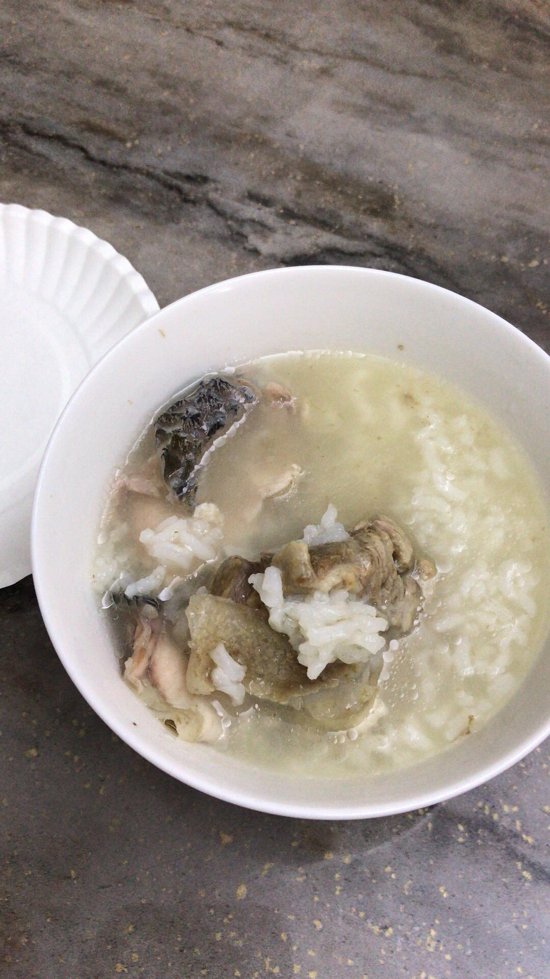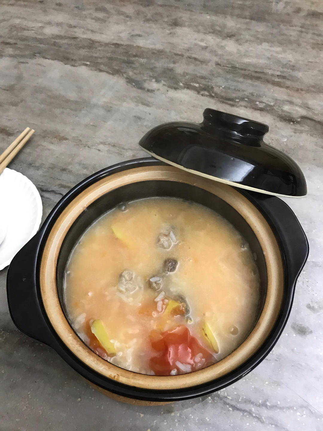 近日早餐偷懒,把猪骨汤倒进炖锅里,加生米直接炖粥,快沸阶段加入生鱼片就准备等吃啦。