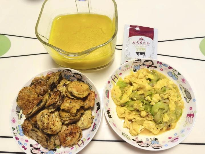 2023年1月4日 晚餐:香煎茄盒+角瓜鸡蛋+南瓜汁