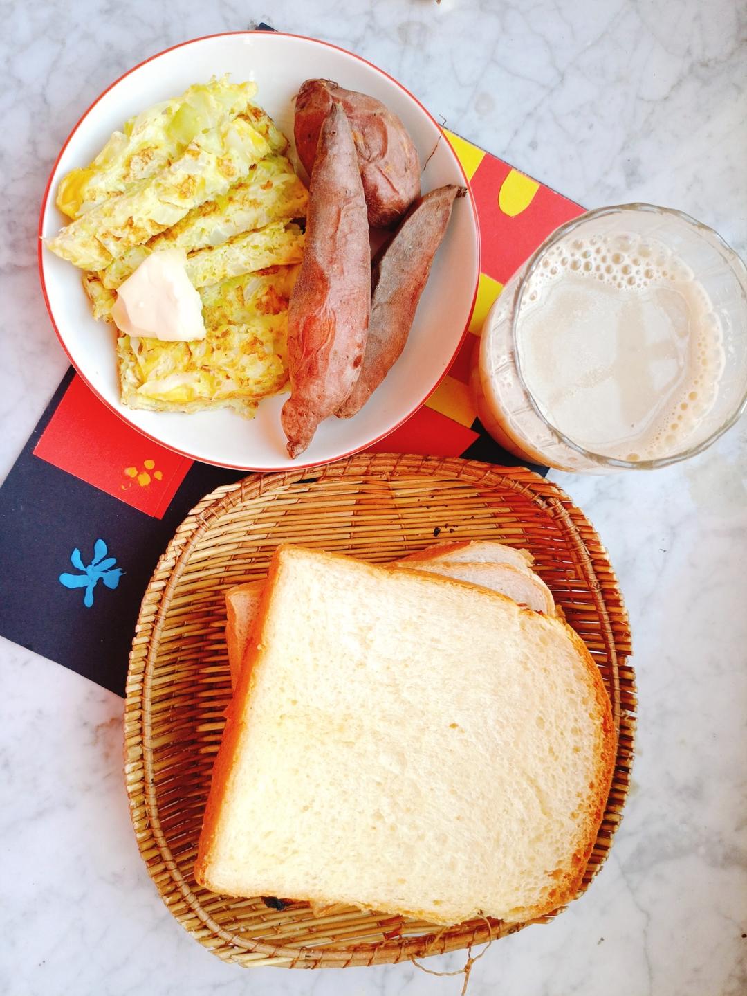 烤地瓜,奶酪,面包,五谷米糊,卷心菜鸡蛋,就是缺肉肉