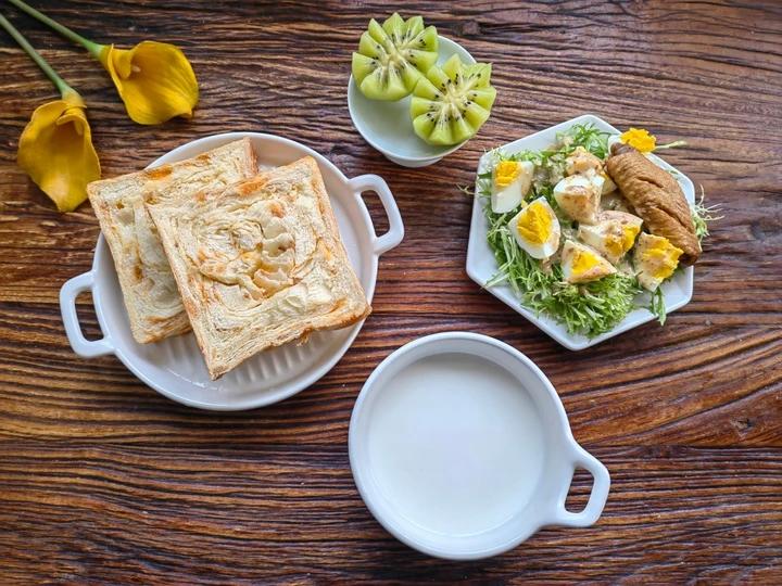 牛奶🥛+肉松面包🍞+鸡蛋苦菊沙拉🥗+猕猴桃🥝