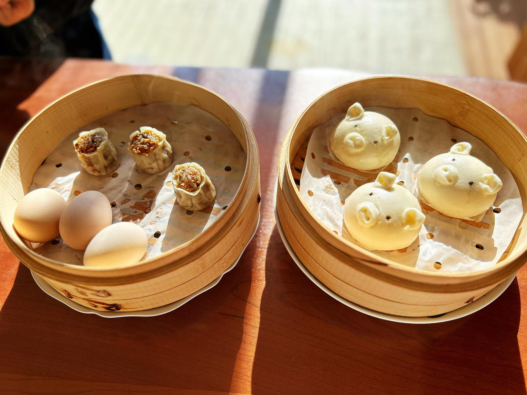 小猪奶黄包、烧麦、糖心鸡蛋、玉米汁