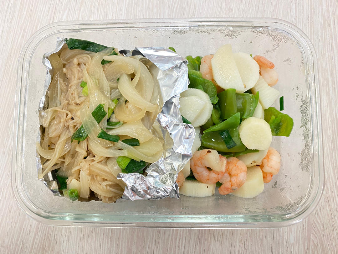 🧅洋葱炒金针菇+青椒山药炒虾仁🍤+一节煮玉米