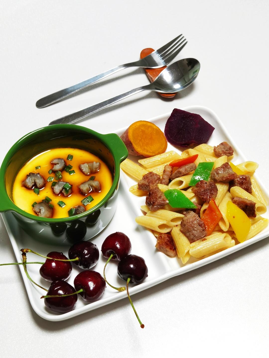今日早餐:海参鸡蛋羹,彩椒牛排粒通心粉,红薯紫薯,车厘子。
