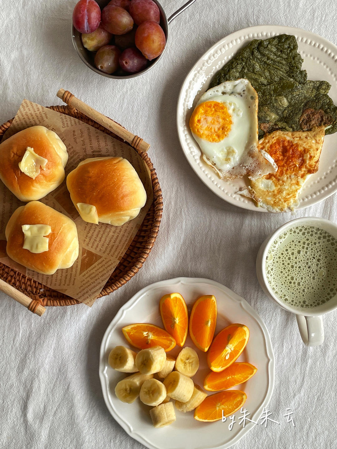 20230311荳菽黑豆浆+牛奶+海盐面包卷+艾草年糕+圣迪乐鸡蛋+橙子+香蕉+西梅。