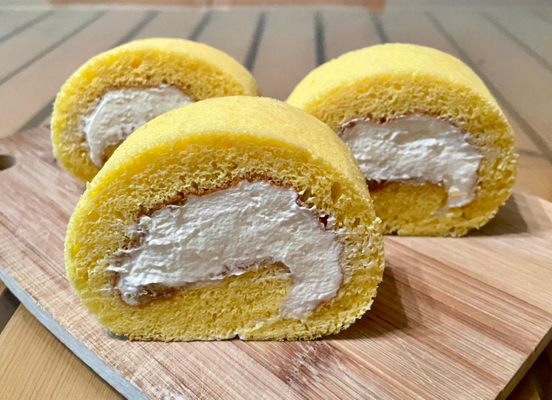 估计黄油温度不够消泡了,抹了不少菠萝果酱卷上去,觉得口感不好,又打发奶油,把蛋糕卷折开,把奶油卷进去,然后切来吃了,没有...