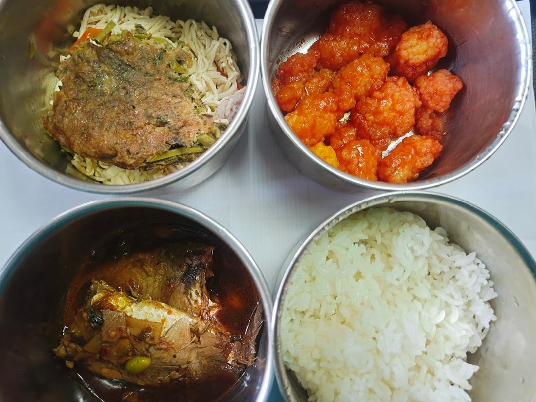 香椿鸡蛋,白米饭,干丝汤,菠萝咕咾肉,烧杂鱼。