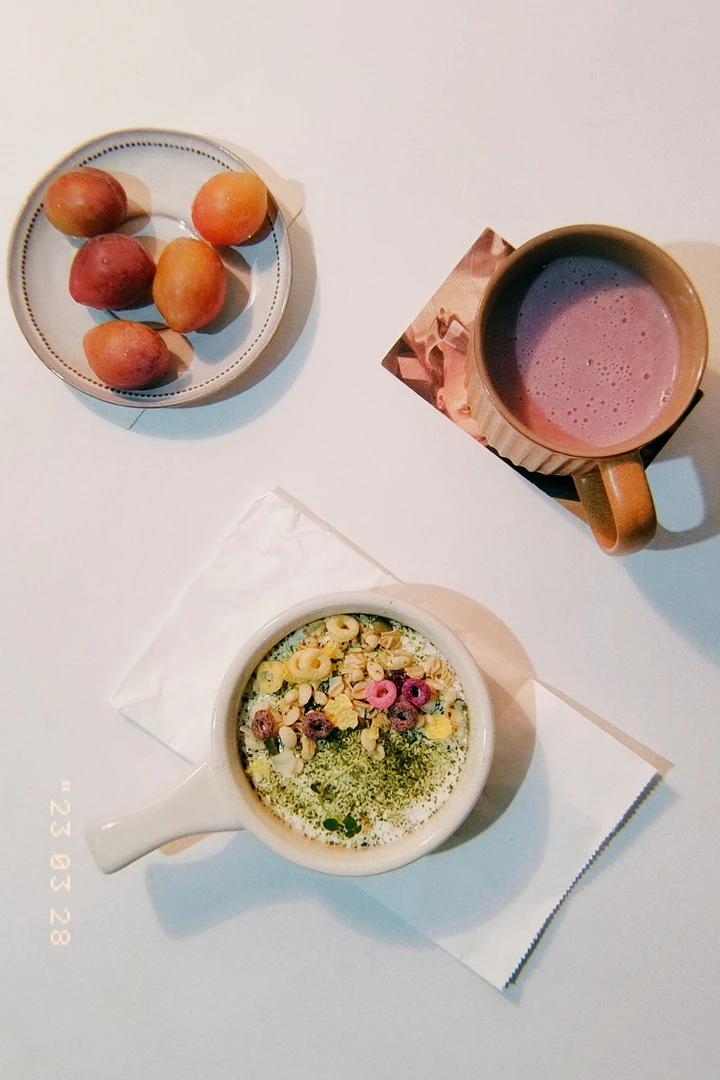 紫薯花生豆浆+抹茶酸奶隔夜燕麦+西梅